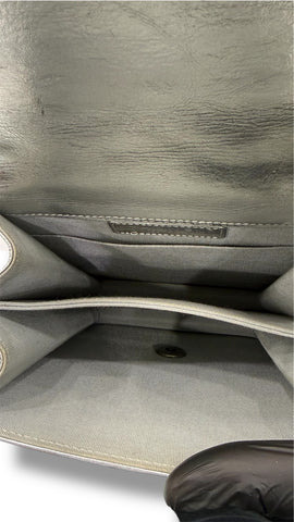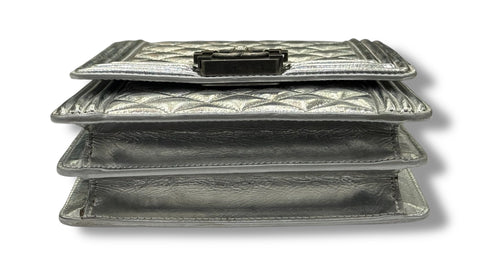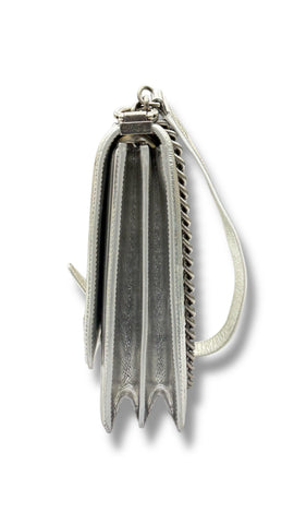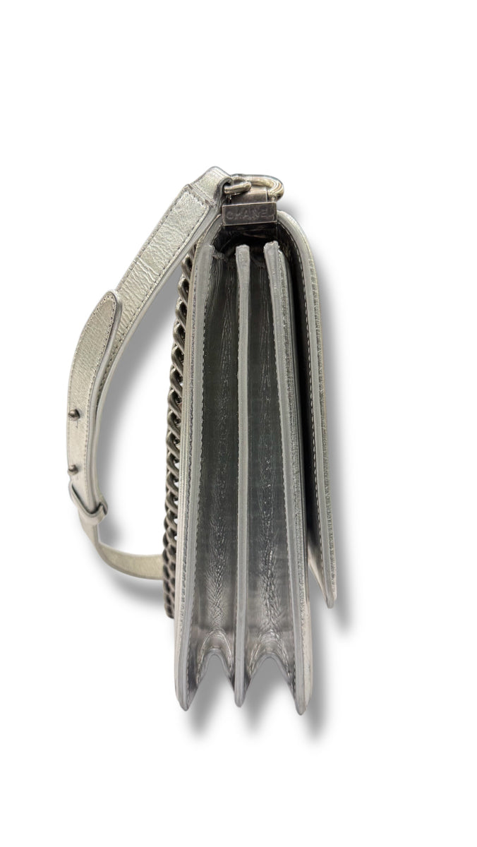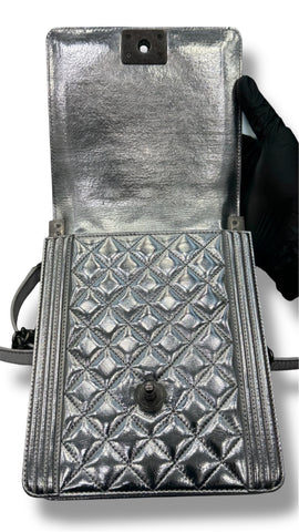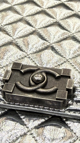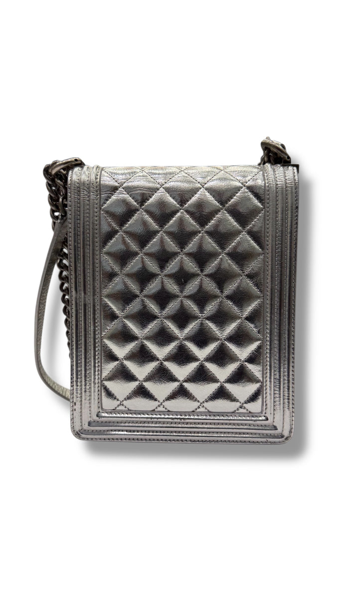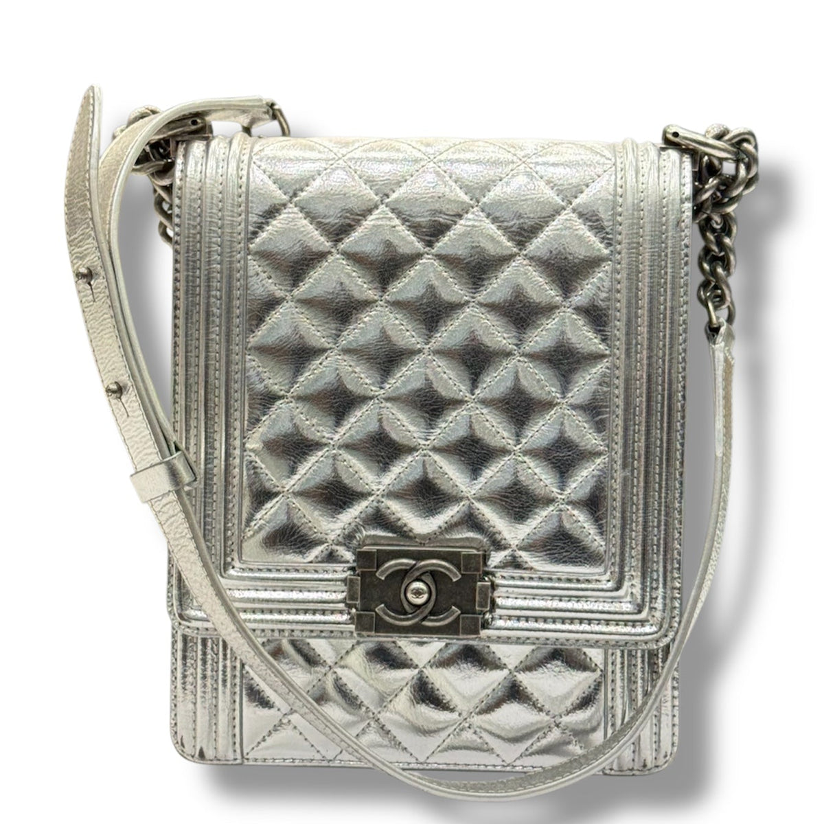 The Chanel Silver Metallic Goatskin Quilted North-South Boy Flap Bag is a striking blend of urban elegance and haute couture craftsmanship. Crafted from premium metallic goatskin leather, this statement piece captures attention with its modern silver sheen and classic Chanel quilted pattern, offering a sophisticated yet contemporary aesthetic.